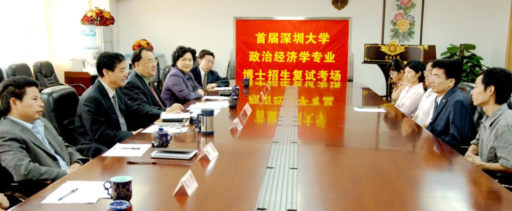 成为硕士学位授予单位后,深大很快就将目标放在争取成为博士学位授予单位上。研究生院的徐诚革副书记回忆道:“2002年,深大第一次申请成为博士学位授予单位,但大家都清楚成功的概率比较低。”2003年收到通知,深大的申请果然没获得批准。“申请之所以失败,是因为深大成为硕士学位授予单位后,正式毕业的硕士研究生仅有3届,正常情况下需要培养8届硕士毕业生后才有资格申请成为博士学位授予单位。”虽然申请没成功,但教育部在深大申请成为博士学位授予单位的过程中发现以往审核办法有不合理之处,在时任校长谢维信教授的领导和推动下,教育部对办法进行了修改,借鉴硕士研究生联合培养的方法,批准深大与华中科技大学联合培养博士生。2005年,深大再次申请成为博士学位授予单位。2006年,终获批准,苏东斌教授领衔的政治经济学、牛憨笨院士领衔的光学工程和谢维信教授领衔的信号与信息处理学科成为深大乃至深圳历史上首批博士点。