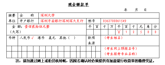 缴费时间及办法:考生于2009年1月4日---1月10日期间,在来我校报名确认前,先到深圳市任何一家深圳平安银行网点缴纳报考费,市外考生可在报名确认当天到深圳平安银行深圳深大支行以下营业点缴费。(地点:①深圳大学教学楼C、D座走廊校园卡办理大厅(周末除外)②深圳大学西门旁)缴费时,考生需填写“现金缴款单”(并在款项来源处注明:考生姓名、网上预报名号及报考专业),填单大致样式如下: