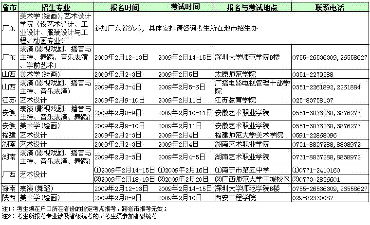 注:⑴演唱歌曲一律清唱;⑵形体展示一律不用音乐伴奏;⑶美术除试卷纸张外,其它材料及用具(画板、画笔、颜料和洗笔桶等)自备;⑷只招音乐类考生。