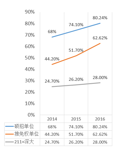 我校2016年硕士研究生招生生源质量大幅提升。来自硕士授权单位的生源比例从2014年的68%,增长到2016年的80.24%;来自推免权单位的生源比例从2014年的44.2%,增长到2016年的62.62%。今年我校接收推免生工作依然突出,共接收391人,接收人数较去年增长68.53%,接收人数与推荐人数比为3.91,列全省高校第一;接收人数占招生计划的19.5%,列全省高校第三。