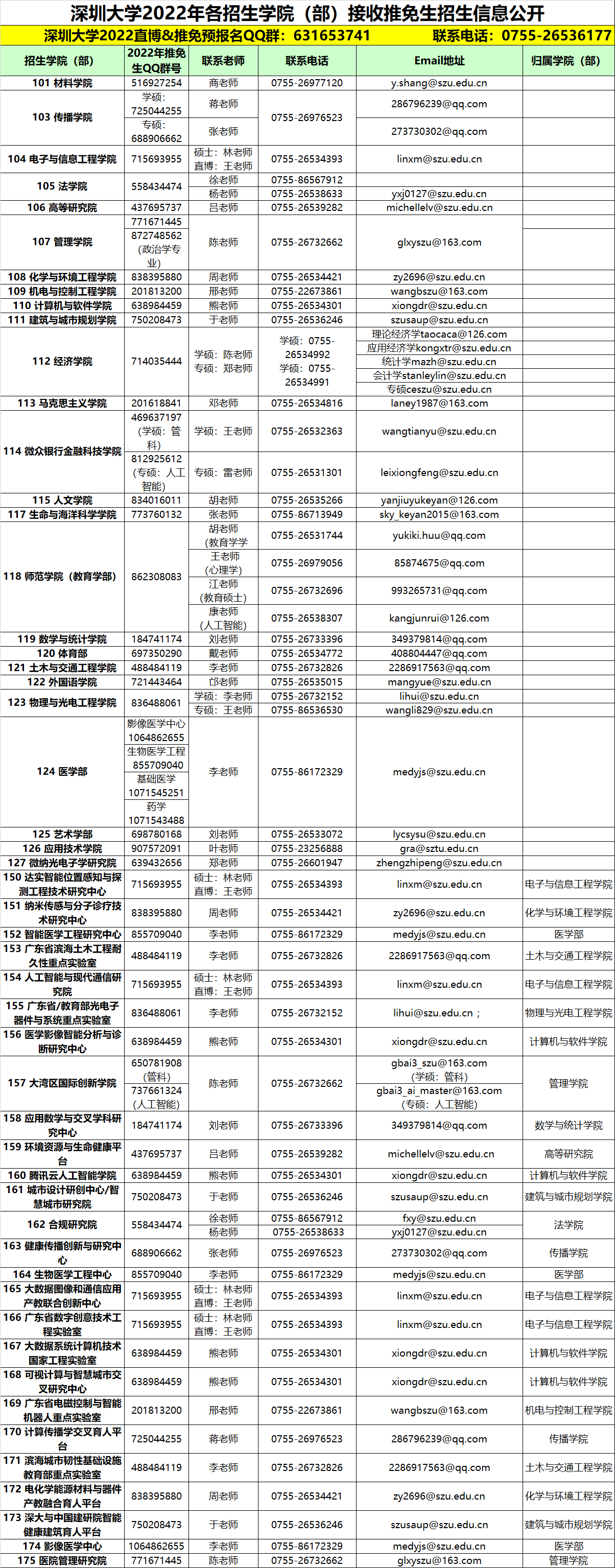 3、为便于各位获得推免资格并且有意推免到深圳大学的优秀学子找到组织,了解学院更多第一手招生资讯,现特此公布深圳大学各招生学院2022年推免生招生联系方式及QQ群。