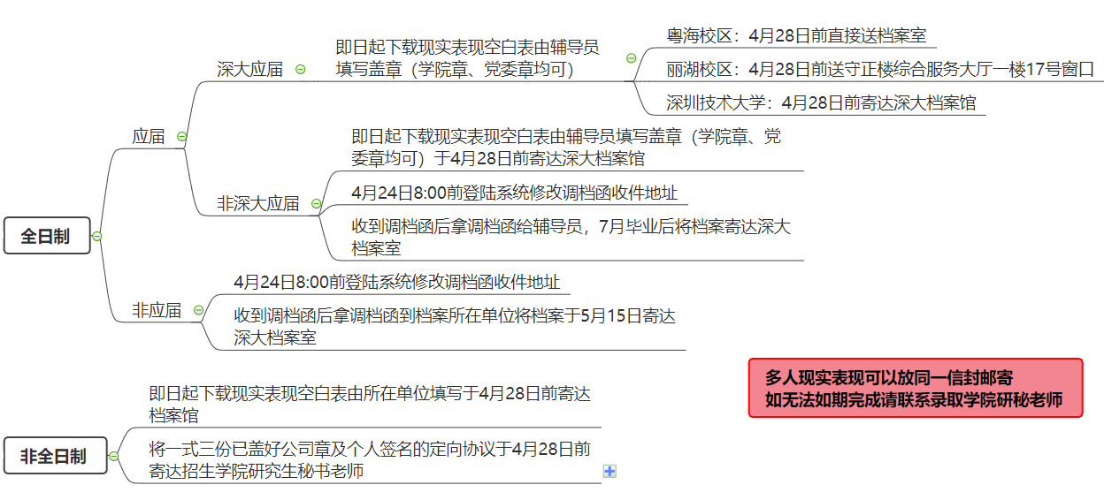 拟录取为全日制硕士的应届本科毕业考生须于4月28日前通过中国邮政EMS将现实表现寄达深圳大学档案馆(深大粤海校区应届生可直接送到档案馆、丽湖校区交守正楼综合服务大厅一楼17号窗口),因疫情等原因无法按时寄达的请联系录取学院研究生秘书老师说明情况;收到调档函后须提交给本科所在高校的学生档案室(或者学院辅导员),待本科毕业后由学生档案室将考生“个人档案”寄往我校研究生档案室。深大应届生调档函无需领取调档函,已全部交给本科学生档案室。