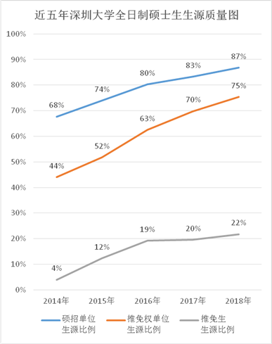 录取考生中不乏来自北京大学、清华大学、上海交通大学、复旦大学、武汉大学、华中科技大学、中山大学、香港理工大学、英国女王大学、澳大利亚昆士兰理工大学、法国图卢兹第一大学等国内外著名高校的全日制本科毕业生。录取的全日制研究生中,本科毕业于硕士授权单位的比例从2014年的68%增长到2018年的87%;本科毕业于推免权单位的从2014年的44%增长到2018年的75%。今年我校共接收推荐免试生(保送生)503人,较去年增长19%,占录取全日制考生人数的22%,无论数量还是比例都超过许多所国家“双一流”建设高校,成为优质生源竞争力最高的地方高校之一。