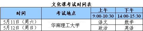 2. 文化考试:文化考试由国家体育总局科教司统一命题,考试科目为:语文、数学、政治、英语。考试地点统一安排在广州市天河区华南理工大学,请考生提前一天到考点查看具体试室安排并熟悉考场。